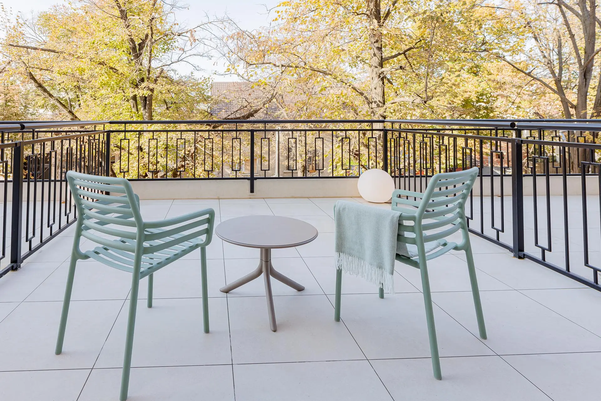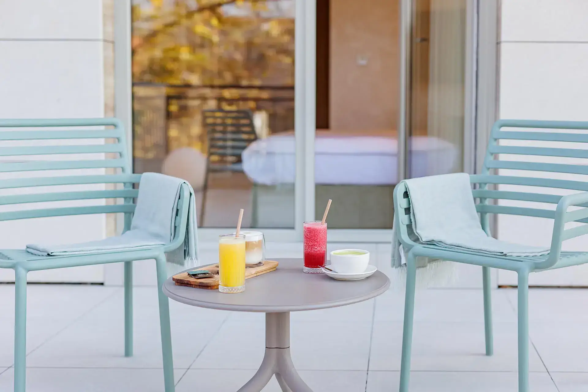 Naša Deluks soba sa terasom nudi spektakularan pogled sa terase na glavnu pešačku zonu u Inđiji.